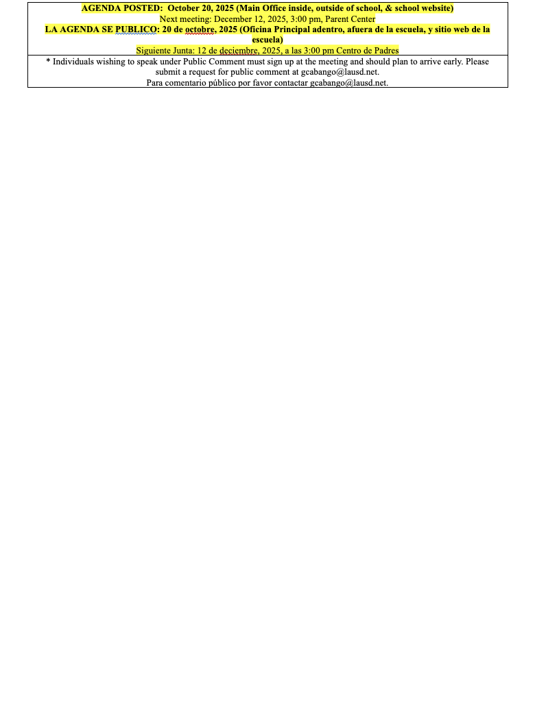 El Consejo del Plantel Escolar (SSC) de la Escuela Secundaria Wilmington STEAM Magnet llevará a cabo su segunda reunión el 23 de octubre de 2025 a las 3:00 p.m. en el Centro de Padres. La agenda incluye palabras de bienvenida, saludo a la bandera, comentarios del público, pase de lista y aprobación de las actas de la reunión anterior. La directora presentará actualizaciones, seguidas de una capacitación sobre cómo comprender los datos para la elaboración del presupuesto y la planificación escolar. Los nuevos asuntos incluyen revisar y aprobar la Política de Participación de Padres y Familias del Título I y el Pacto Escuela-Padres, dialogar sobre la Política del Distrito del Título I, analizar los datos de rendimiento académico, asistencia y suspensiones estudiantiles, y evaluar los objetivos del SPSA 2024–25 para preparar el plan 2025–26. El consejo también considerará enmendar los estatutos, monitorear la implementación del SPSA y los gastos del presupuesto, y responder a las recomendaciones del Comité ELAC. La reunión concluirá con anuncios y clausura.